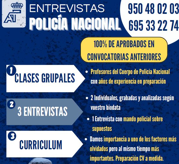 Tenemos un alto índice de aprobados a la oposición de Policía Nacional y, para conseguir el aprobado, simplemente tienes que seguir nuestro plan de trabajo, en el que además de una guía completa, te ofrecemos un material único que marca la diferencia respecto al de otras academias: esquemas de cada tema en formato presentación, clases grabadas en directo, test de cada tema, simulacros de examen, repasos intensivos, etc. Somos la academia de clases particulares para la oposición, no te conformes con menos, para nosotros no serás un número, estaremos pendientes de ti y de tu evolución durante todo el proceso, no dejándote decaer en ningún momento.