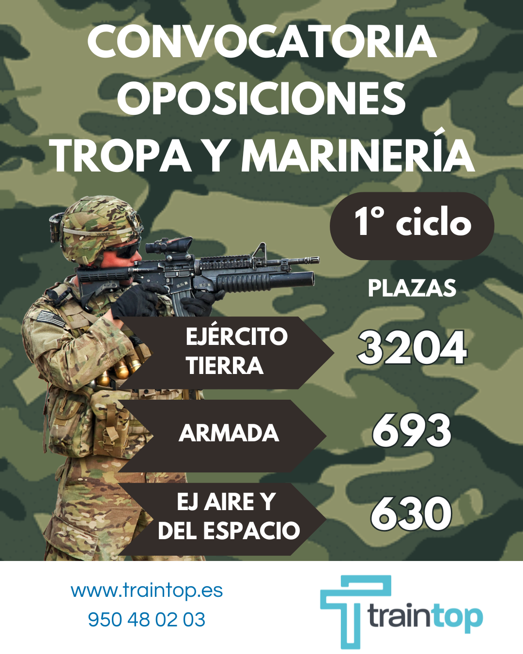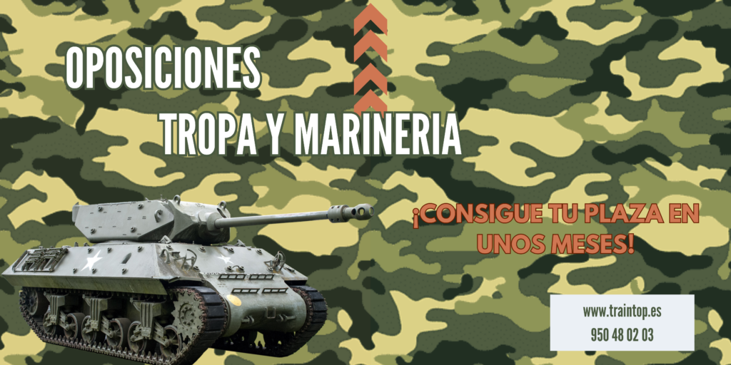Si tu sueño es formar parte del ejército, y quieres tener la certeza de prepararte a conciencia la prueba que te dará tu plaza, no lo dudes y deja tu preparación en manos de Traintop, tu academia de oposiciones para tropa y marinería. Llámanos y te informamos mejor, 950 48 02 03.